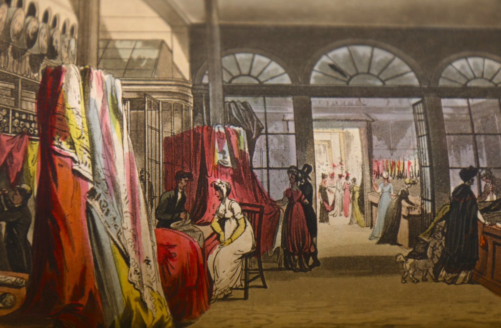 “The house is one hundred and fifty feet in length from front to back, and of proportionate width. It is fitted up with great taste, and is divided by glazed partitions into four departments, for the various branches of the extensive business, which is there carried on. Immediately at the entrance is the first department, which is exclusively appropriated to the sale of furs and fans. The second contains articles of haberdashery of every description, silks, muslins, lace, gloves, etc. In the third shop, on the right, you meet with a rich assortment of jewelry, ornamental articles in ormolu, French clocks, etc.; and on the left, with all the different kinds of perfumery necessary for the toilette. The fourth is set apart for millinery and dresses; so that there is no article of female attire or decoration, but what may be here procured in the first style of elegance and fashion. This concern has been conducted for the last twelve years by the present proprietors who have spared neither trouble nor expense to ensure the establishment of a superiority over every other in Europe, and to render it perfectly unique in its kind.”