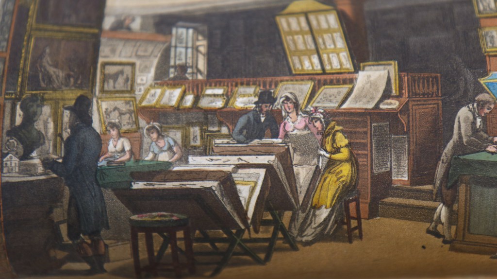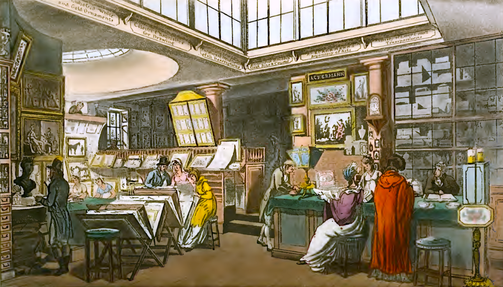 A photograph of the original fabric samples pasted into Ackermann’s Repository of Arts vol. 1 (Janurary, 1809).A brief history of Ackermann’s Repository of Arts (1809-1828)An illustration of the interior of Ackermann’s print emporium at No. 101 Strand reproduced from Ackermann’s Repository of Arts vol. 1 (1809).